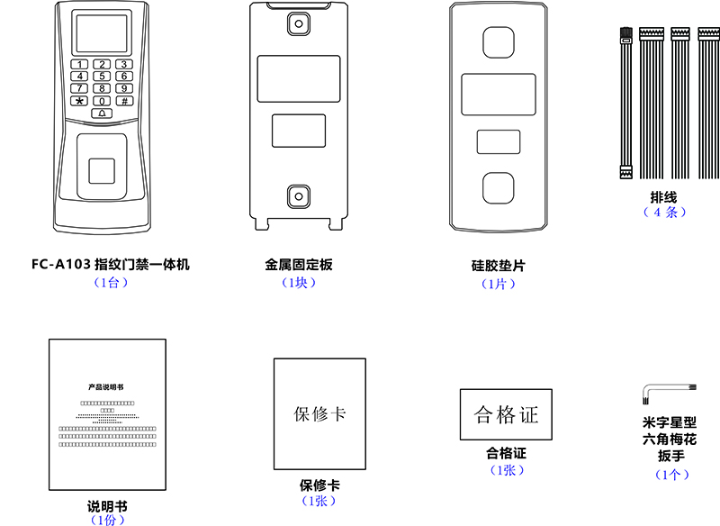 FC-A103是一款指纹门禁一体机,支持联网门禁考勤,也支持独立工作。采用多核ARM处理器,集合海量存储器,内置活体识别指纹电路,支持高速识别与拒绝假指纹。指纹识别时间 <1S,采用1.8寸TFT彩屏,支持1000指纹、1000卡、1000密码、10万笔记录、(可定制支持ID卡或IC卡)、TCP/IP联网、RS485联网、支持1组开门继电器、1组门磁、1组报警输出,支持U盘备份数据、支持云平台。中文简体、英文(可定制其它语言)