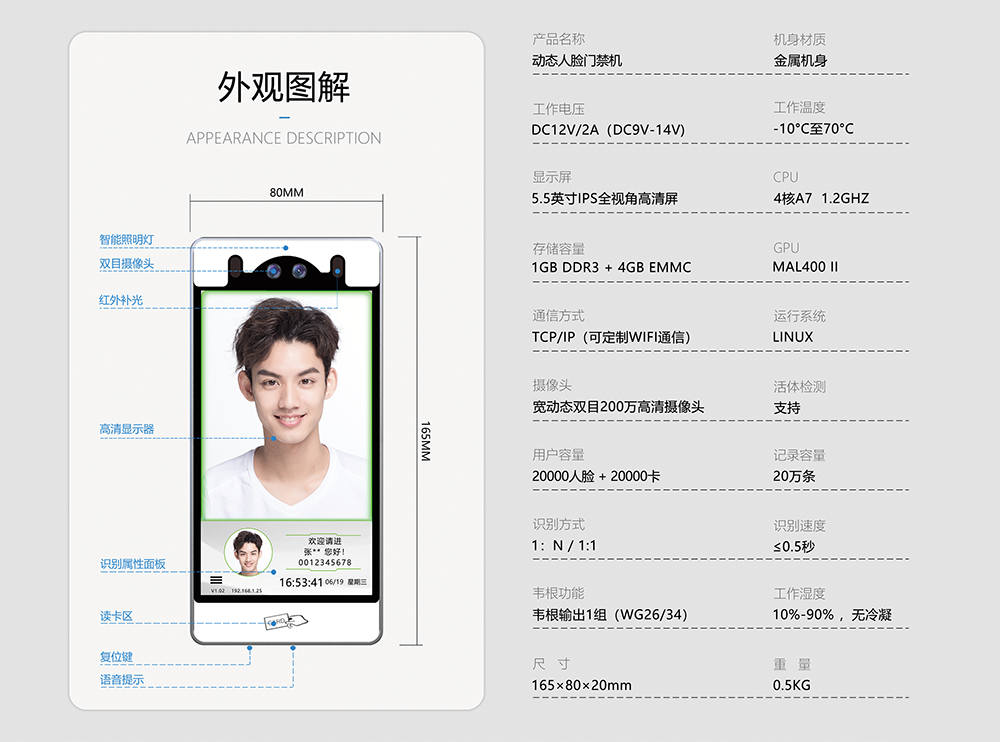 您好,欢迎使用我们的产品,谢谢您的支持。以下图片为FC-8100T动态人脸门禁机的外观尺寸与技术参数,请查看。