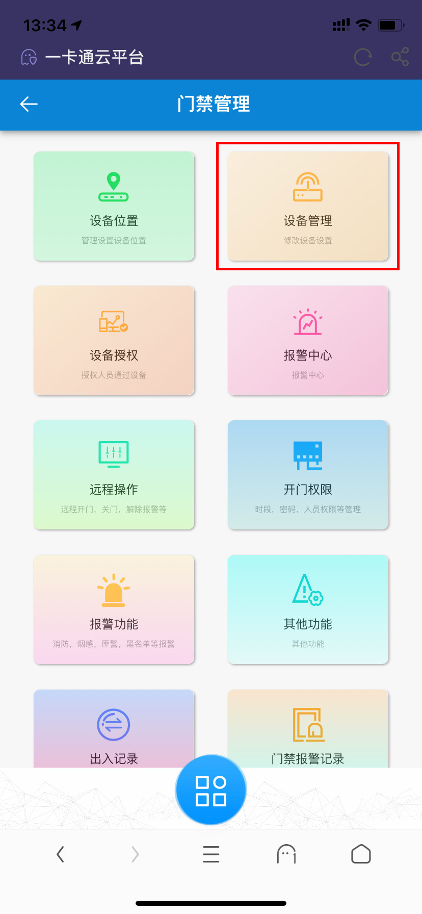 1.手机登录云平台(如无套账,请注册套账并联系我们激活),选择‘门禁’菜单中的‘设备管理’菜单,点击‘添加’按钮,通过输入16位SN码添加FC-8100T人脸机至云系统中。