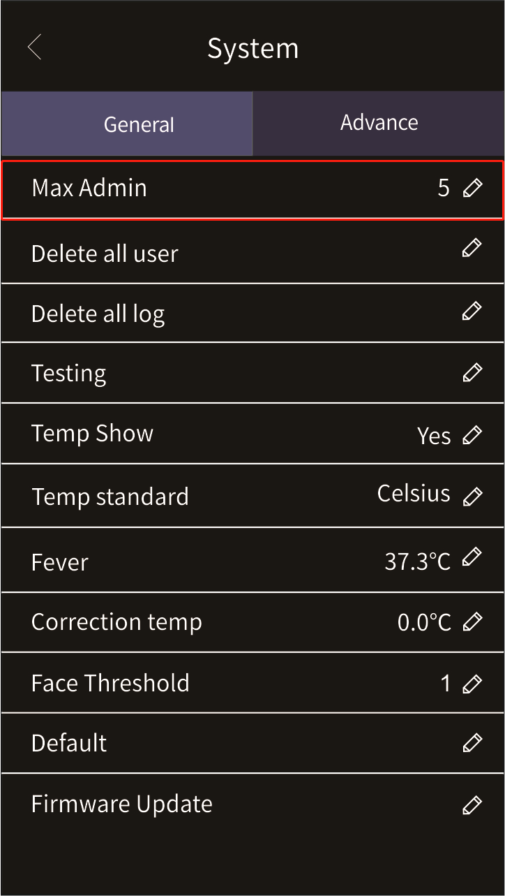 First, touch the menu button on the touch screen to switch to ‘Administrator Identification’, verify the administrator’s face recognition or click on ‘Administrator Identification’ to enter the administrator password to enter the system management interface (with the photo). Then click on the advanced settings in the ‘System Settings’ (pictured), you can modify the total number of face recognition access controller administrators, and you can set up to 255 administrators.