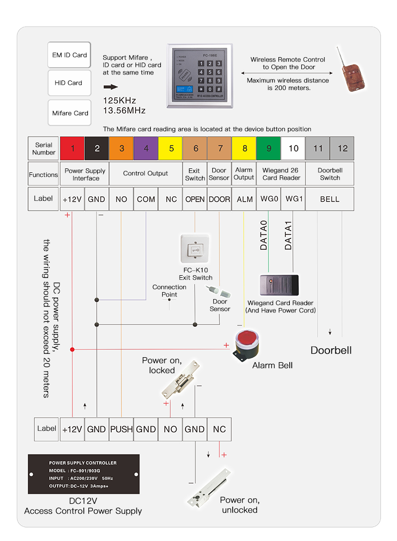 Hello, thank you for purchasing our company's FC-198E keyboard access controller, you can refer to the following pictures to connect: