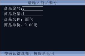 在菜单收费模式下进行消费,直接在消费机上按数字(商品代码、商品编号),按“确定”键出现如下界面,此时可再按数字(商品数量),按“确定”键,会出现商品清单。