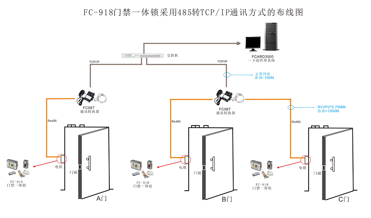 您好,感谢您对我公司的关注,您可以通过以下给您提供的FCL-918门禁一体锁 采用458转TCP/IP通讯方式的布线图了解我公司产品,如果想近一步了解我公司产品,欢迎拨打免费咨询电话:400-688-6663