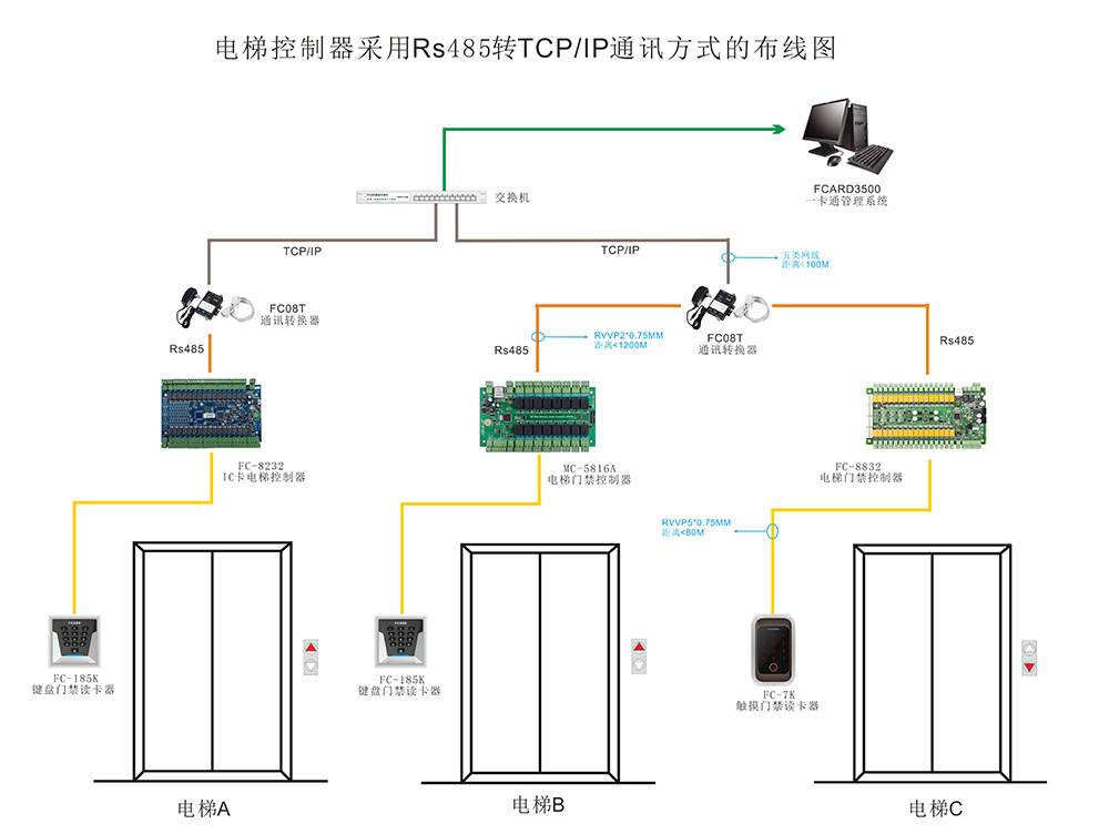 电梯门禁控制器采用Rs485转TCP/IP通讯方式的布线图