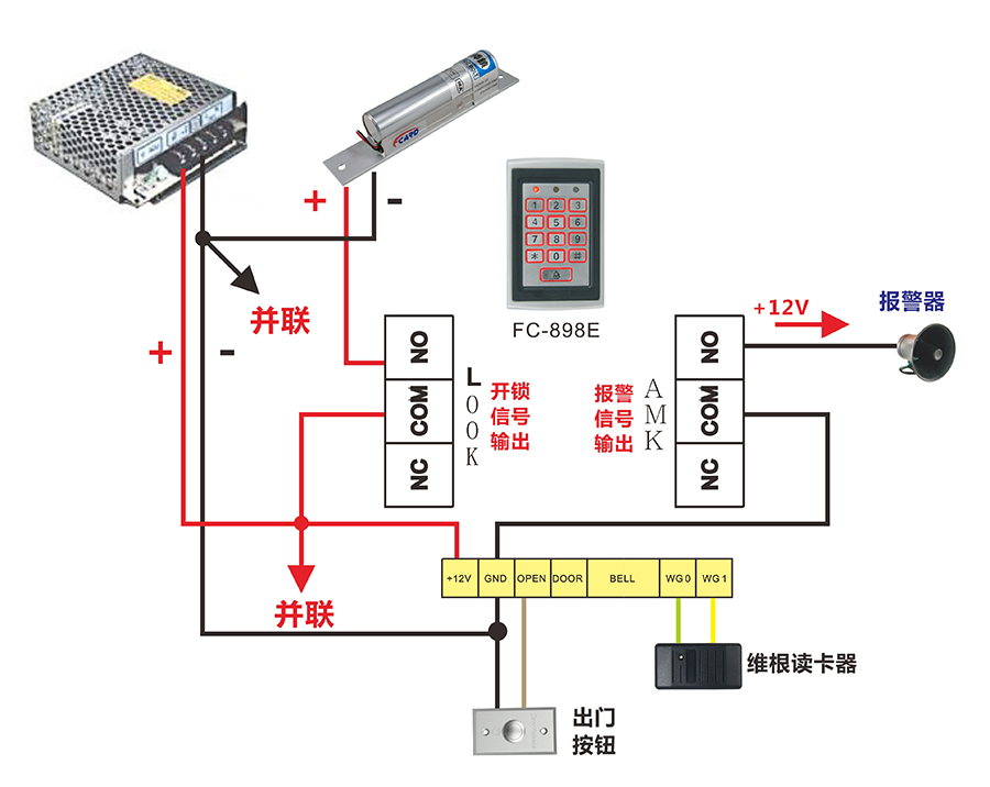 我们选用了贵公司的FC-898E门禁一体机,12V开关电源和电插锁,安装调试时我们按照说明书上的连线图来接线,锁锁不了门,请问是什么问题,怎样解决?