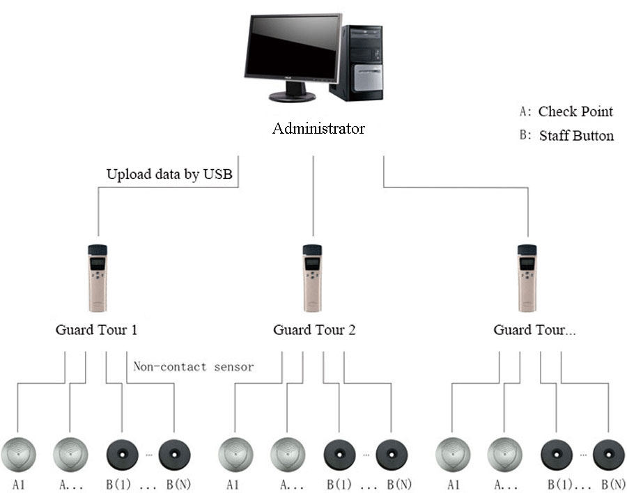 The guard tour system including: guard tour、USA communication cable ( also used for recharging)、Charger、personal button、tour site and software.