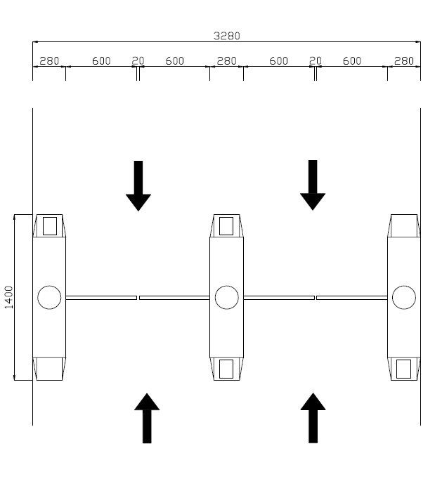 共2个人员进出通道,设计为摆闸系统,每个通道共需要2台单机芯摆闸和1台双机芯摆闸。
