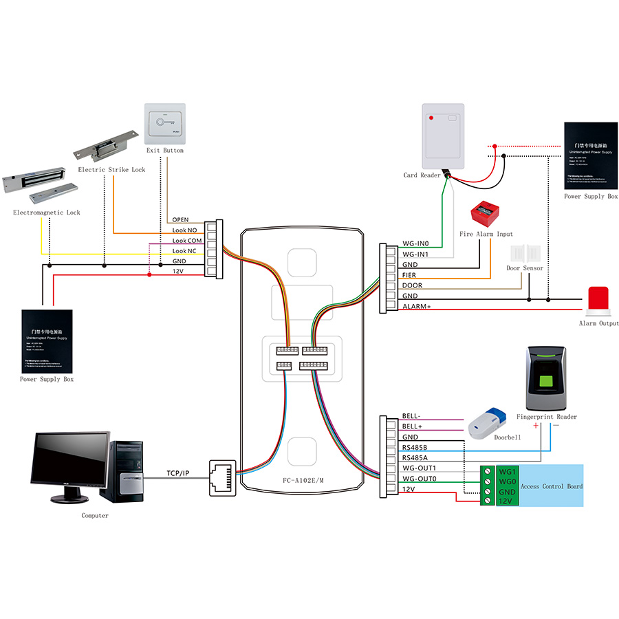FC-A102 is a fingerprint access controller, which supports networked access control and attendance, as well as independent work. It adopts multi-core ARM processor, integrates massive memory, built-in live fingerprint recognition circuit, supports high-speed recognition and rejection of fake fingerprints. Fingerprint recognition time <1S, adopts 2.8-inch TFT color screen, supporting 5000 fingerprints, 5000 cards, 5000 passwords, 200,000 records (can be customized to support ID card or Mifare card), TCP/IP networking, RS485 networking, supporting 1 set of door opening relays , 1 group of door sensor, 1 group of alarm output, support U disk backup data, support cloud platform. Simplified Chinese and English (other languages can be customized).