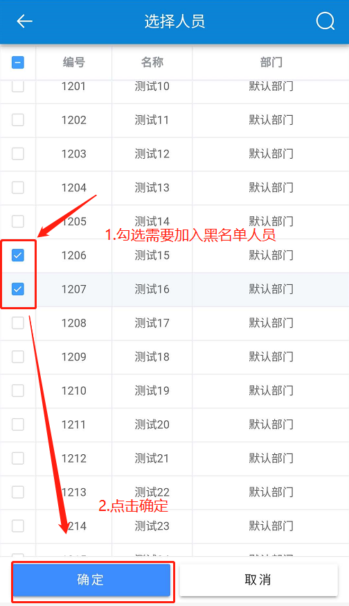 在【人员选择】页面-勾选人员-点击【确定】-》》再次【确认】。如下图所示: