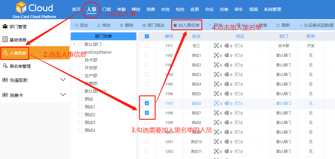 点击【人事】-【人事信息】-勾选人员-点击【加入黑名单】。如下图4-1所示: