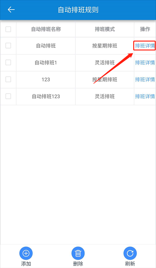 点击【考勤】-【排班管理】-【自动排班规则】-点击【添加】。如图25-1所示: