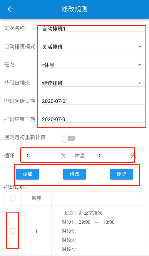 在【自动排班规则】页面,点击表格中规则-点击【修改】。如图25-3所示: