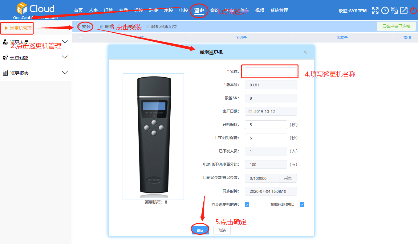 点击【巡更】-【巡更机管理】-点击【安装】-设置巡更机参数-点击【确定】。如图32-2所示: