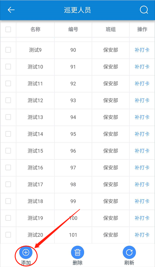 点击【巡更】-【巡更人员】-【添加】-设置班组,勾选人员-点击【确定】。如下图所示: