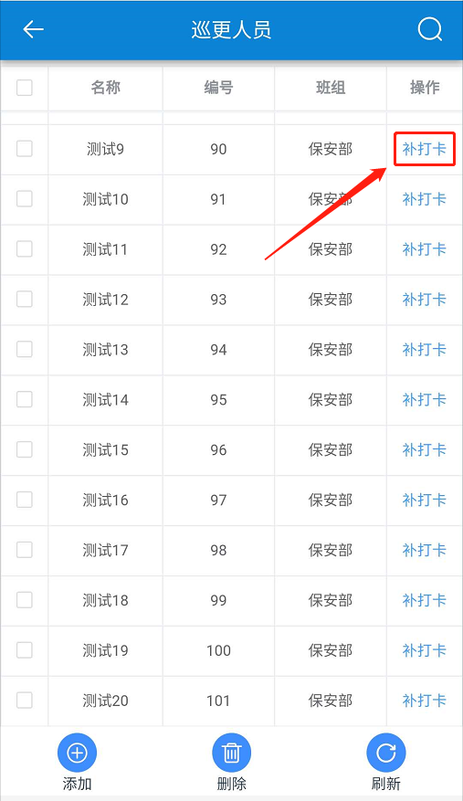 点击【巡更】-【巡更人员】-【补打卡】-设置补打卡【巡更点、登记日期、备注】-点击【确定】。如下图所示: