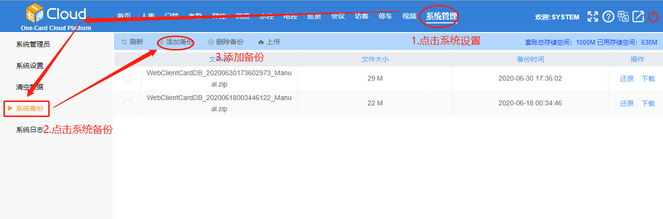 点击【系统管理】-【系统备份】-【还原】。如下图所示: