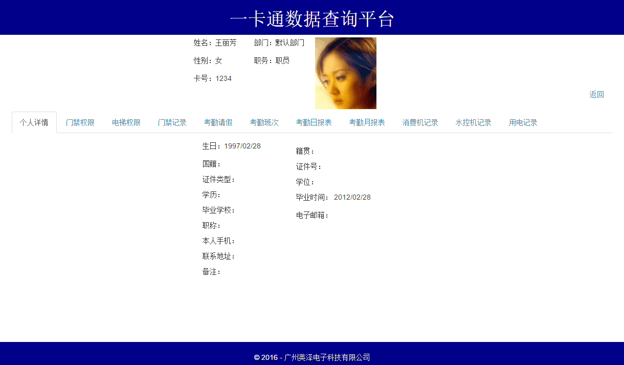 19. Join the BS query platform, support webpages to directly browse the personnel data (personnel, access control, attendance, consumption, elevator) in each system of the one card pass