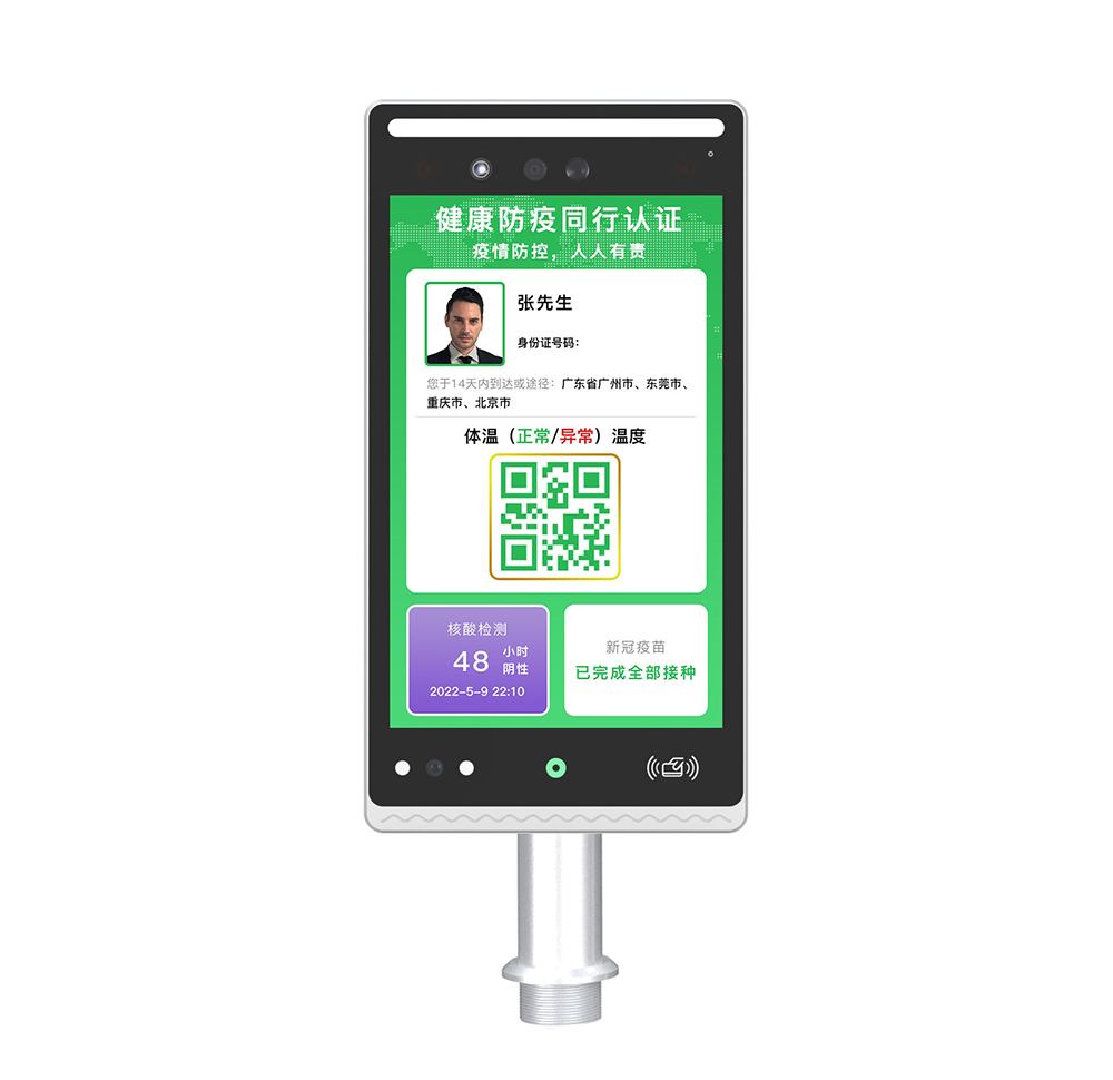 高端SONY 高清双目摄像头、10寸高清IPS屏、支持50000人(可定制100000人)、支持100万条识别记录与5万条识别照片、急速测温,识别距离0.3~1.2米、支持:门禁功能、闸机控制、TCP/IP通信、WIFI通信、4G通讯、人脸测温、身份证读卡器、健康码二维码;设备配闸机支架、含健康码授权。
