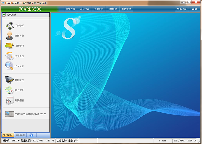 FCARD3500一卡通管理系统采用了九大块模块化结构设计:系统数据模块、系统图文监控模块、人事管理模块、门禁系统模块、考勤系统模块、电梯门禁模块、巡更系统模块、会议签到模块、消费管理模块等于一体。