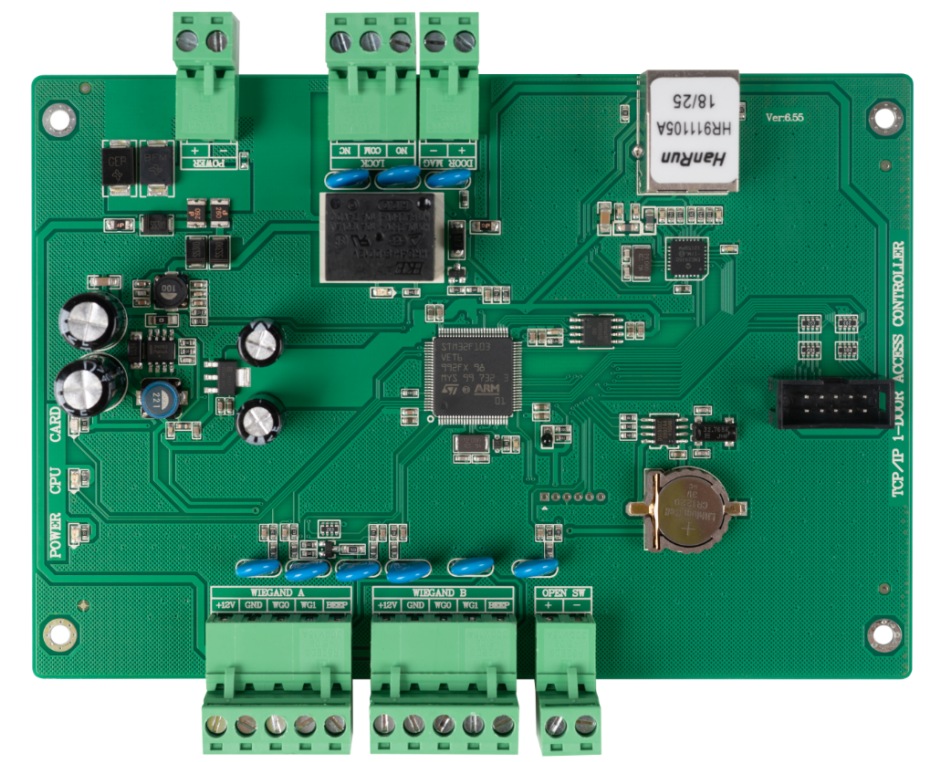 可管理2个门、支持两组4.2万用户数据、10万笔事件记录、提供2组7A门锁继电器输出、2组门磁、2组出门开关、4组WG26、34读卡器接口、1组TCP/IP通信口。电压电流DC12V <350mA。尺寸:160×110×20mm